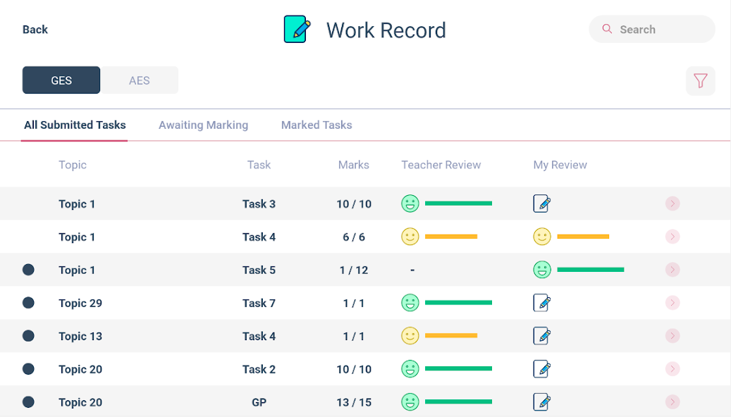 工作记录:学生可以看到他们在课程上取得的进步,他们完成了多少个主题 /任务,剩下多少个主题 /任务。他们可以对提交的任务提交自己的个人审查,并查看老师标记的任务的评论和标记。